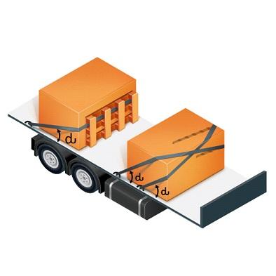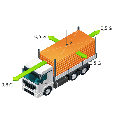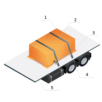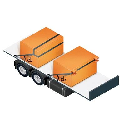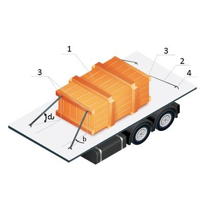 Теперь рассмотрим крепление груза способами увязки, используя в качестве средств крепления тканые синтетические ремни. Как упоминалось ранее, средства крепления в этом случае напрямую воспринимают действующую на груз силу инерции и работают на растяжение, то есть воспринимают растягивающую нагрузку. Расчётным параметром ремня при креплении груза увязкой является максимальная величина прямого натяжения - αC, на которое рассчитывается тяжной ремень, чтобы поддерживать это натяжение при использовании. Условие неподвижности груза при креплении увязкой остаётся тем же, что и при блокировке, т.е. сумма сил, действующих на груз в каждом из указанных направлений должна быть равна нолю: